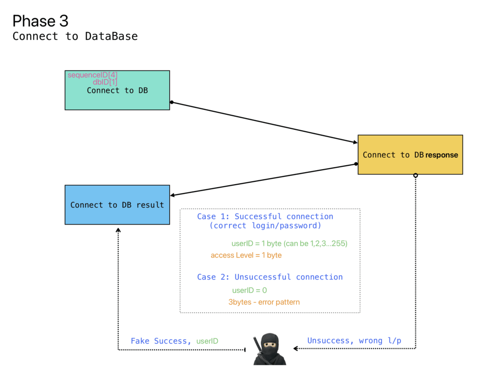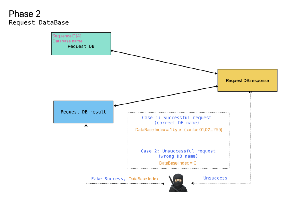 In the second phase, the client sends a request – Sequence ID (from the first phase) and the name of the database to which we want to connect. In response, the server sends the database ID (DataBase Index) if the database with this name exists. Or DataBase Index=0 if there is no such database.
