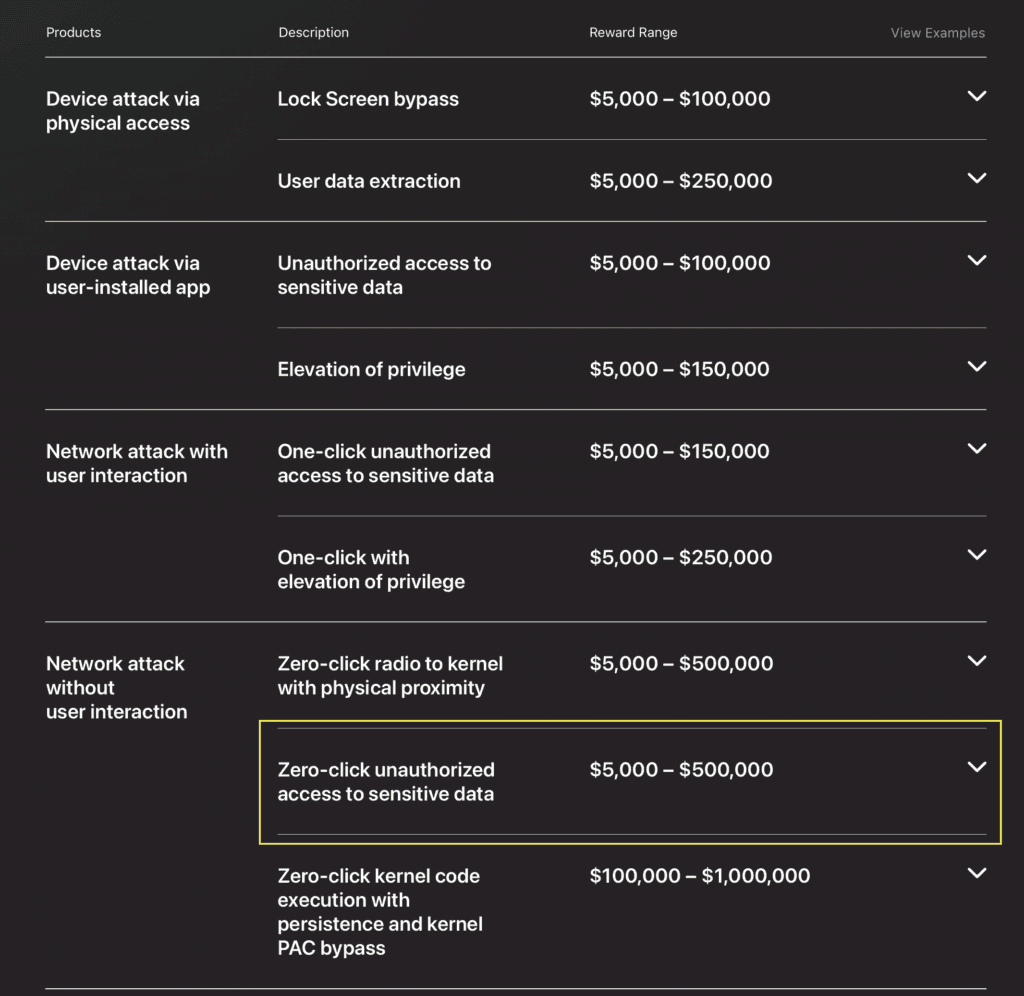 “If you submit research for a security or privacy vulnerability, your report may be eligible for a reward. The Apple Security Bounty program is designed to recognize your work in helping us protect the security and privacy of our users.”